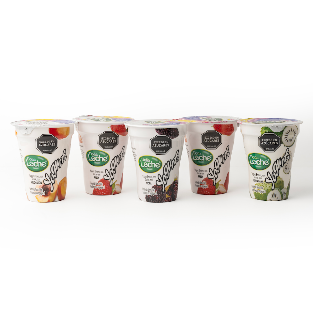 Yogurt entero con dulce con fruta, sabor a Fresa, Guanábana, Mora y Melocotón.