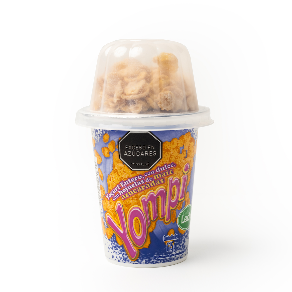 Yogurt entero con dulce, acompañado con hojuelas de maíz azucarado. 100 Gr de Yogurt y 15Gr de Cereal.