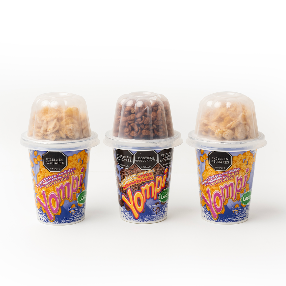 Yogurt entero con dulce, acompañado con cereales (hojuelas azucaradas y/o arroz sabor a chocolate). 100 Gr de Yogurt y 15Gr de Cereal.